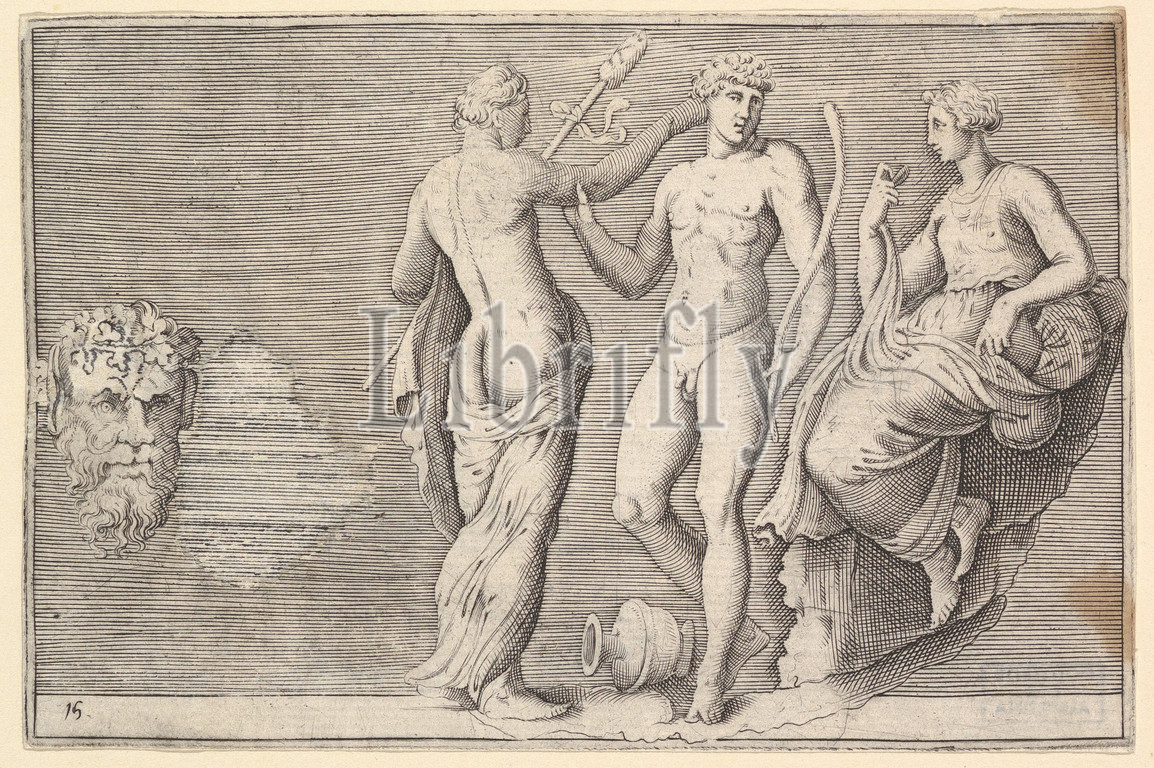 Head, Satyr, Three Figures, published ca, 1599–1622, Engraving, Third state, plate, 3 7/16 x 4 7/8, 8.8 12.4 cm, Prints, Engraved by Anonymous, Italian, 16th century, After Battista Franco, Venice ca., 1510–1561, Venice