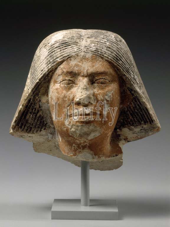 Head, statue, older man, Old Kingdom, Dynasty 4–5, ca, 2550–2460 B.C, Egypt, Limestone, paint, 4 x 4 3/16 3 3/8, 10.2 10.7 8.5 cm, small, head, part, standing statue, back pillar, Narrow eyes, remains, jutting nose, seamed face, broad flat, lips, restricted number, realistic depictions, aged officials