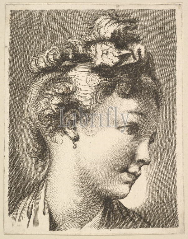 Head of a woman with her head turned to the left, from Livre de Têtes Gravées d'apres F. Boucher et Autres (Book of Heads Engraved after F. Boucher and Others), 18th century, Etching and engraving, Sheet: 7 x 5 7/16 in. (17.8 x 13.8 cm) trimmed to platemark, Prints, Anonymous, French, 18th century, François Boucher (French, Paris 1703–1770 Paris)