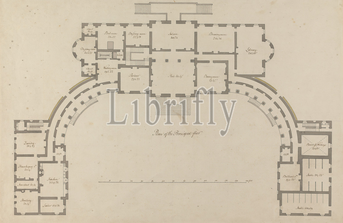 Headfort House, Ireland, Plan, Principal Floor, Sir William Chambers RA, 1723–1796, British, ca, 1765, Graphite, gray wash, watercolor, pen, black, brown ink, moderately thick, moderately textured, cream laid paper, Sheet, architectural subject, bedroom, billiards, country house, drawing room, floor plan, kitchen, larder, library, parlor, rooms, saloon, scale, rule, stable, Headfort House, Ireland, Kells, Leinster, Meath