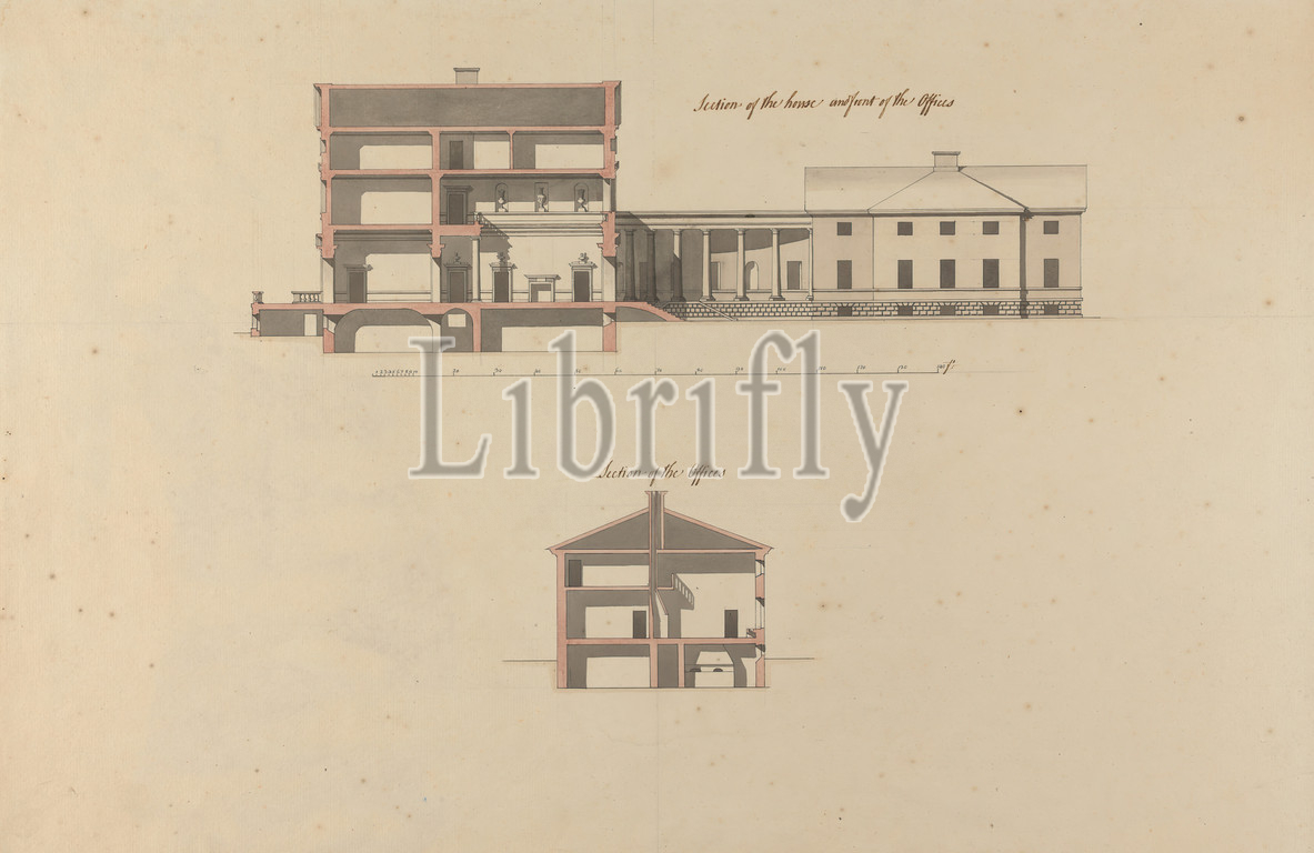 Headfort House, Ireland, Sections, House, Offices, Sir William Chambers RA, 1723–1796, British, 1765, Graphite, watercolor, pen, brown ink, moderately thick, moderately textured, beige laid paper, Sheet, architectural subject, balustrade, bust, fireplace, house, kitchen, offices, scale, rule, section, drawing, urn, Headfort House, Ireland, Kells, Leinster, Meath