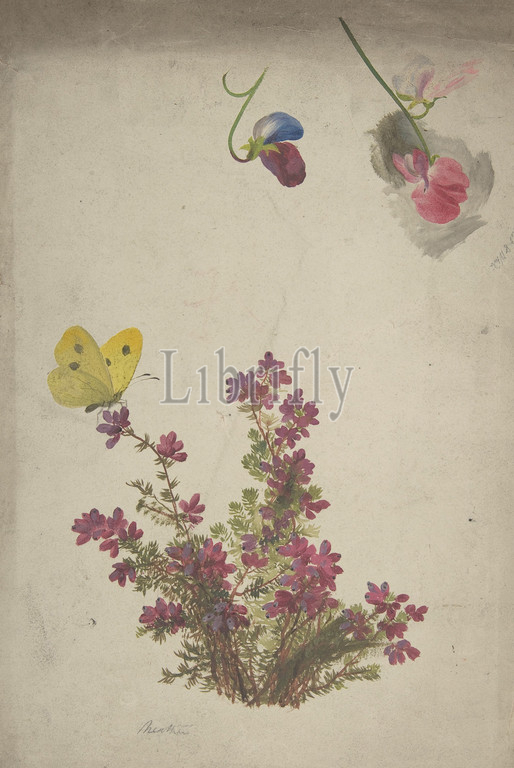 Heather, Sweet Peas, Butterfly, 19th century, Gouache, watercolor, grey prepared ground, Sheet, 13 11/16, 9 3/4, 34.7, 24.8 cm, Drawings, Anonymous, British