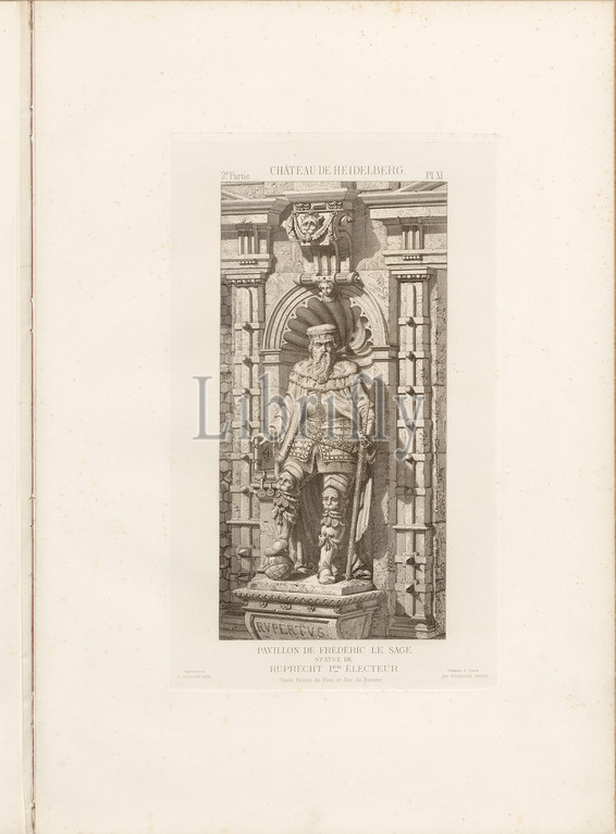 Heidelberg Castle, Frederick the Sage Pavilion, Ruprecht Statue 1. Elector, Statue of Ruprecht I in the Friedrichsbau of Heidelberg Castle, signed: Dessiné et Gravé par Rodolphe Pfnor; Imprimerie F. Chardon aîné, Fig. 25, 2nd lot, Pl. XI, after p. 16, Pfnor, Rodolphe (dessiné et gravé); Chardon, F. aîné (imprimé), Rodolphe Pfnor, Daniel Ramée: Monographie du Château de Heidelberg. Paris: A. Morel et Cie, Editeurs, 1859