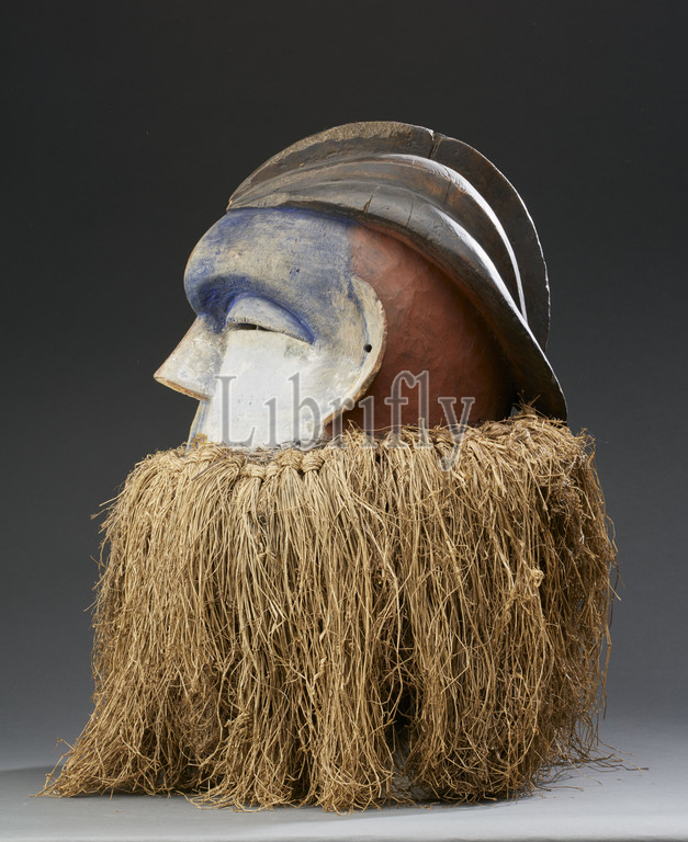 helmet mask, Kwese, first half of 20th century, wood, pigment, fiber, 15-3/4 x 18-1/2 x 16 in., African Art