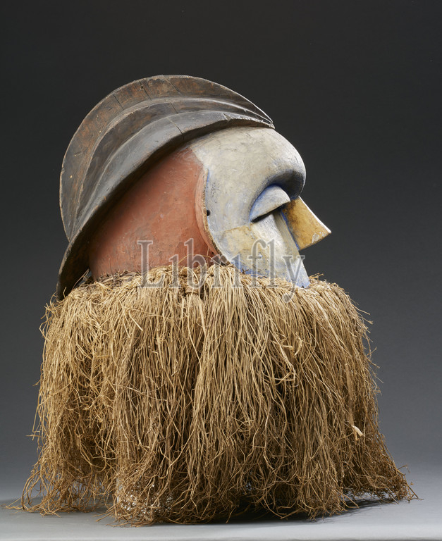 helmet mask, Kwese, first half, 20th century, wood, pigment, fiber, 15-3/4 x 18-1/2 x 16, African Art