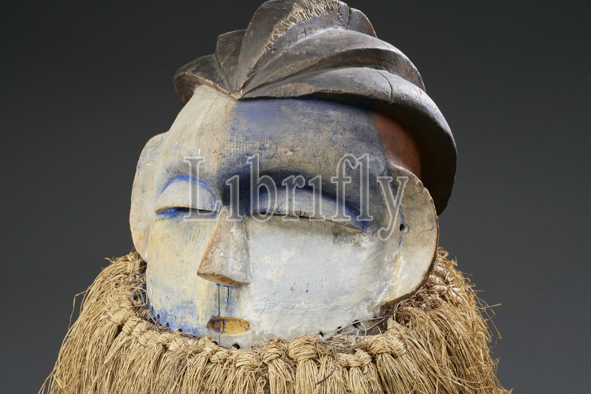 helmet mask, Kwese, first half of 20th century, wood, pigment, fiber, 15-3/4 x 18-1/2 x 16 in., African Art