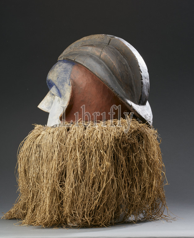 helmet mask, Kwese, first half, 20th century, wood, pigment, fiber, 15-3/4 x 18-1/2 x 16, African Art