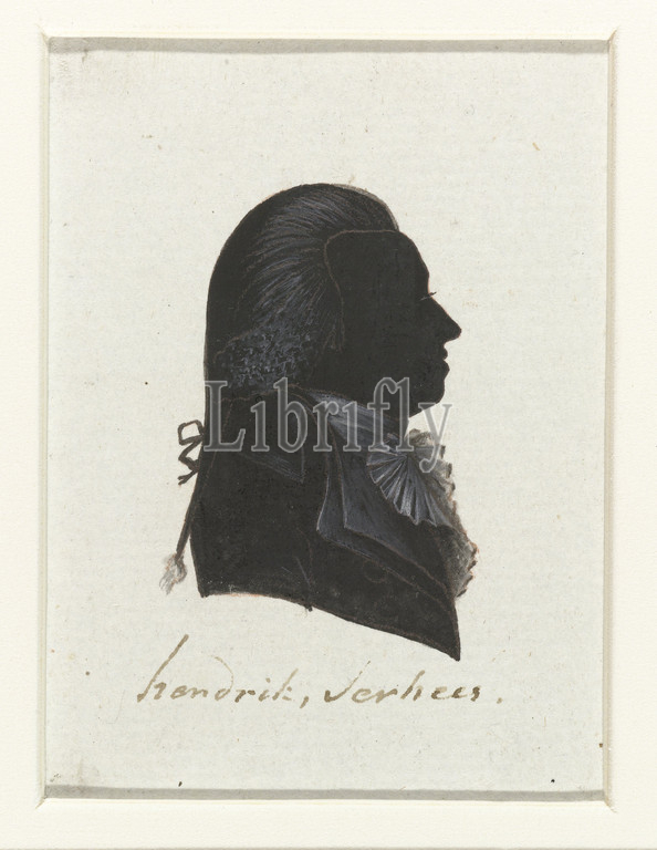 Hendrik Verhees, Representatives of the first National Assembly of the Batavian Republic (series title ), Silhouette of bust in profile to the right. Tail wig and jabot. Inscription, o .: Hendrik Verhees, The Hague, Oss, Hendrick Verhees jr, National Assembly, Batavian Republic, Hausdorff (possibly), Netherlands, 1796, paper, India ink (ink), drawing, h 8.5 cm × w 6.3 cm