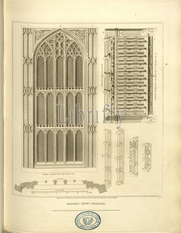 Henry VII Chapel, Details of the Henry VII Chapel in Westminster Abbey, signed: Engraved by John Roff from Drawings by Thompson, Fig. 18, Pl. IX, after p. 15, Thompson (drawing); Roffe, John (engraved), 1812, John Britton: The architectural antiquities of Great Britain: represented and illustrated in a series of views, elevations, plans, sections and details of various ancient English edifices: with historical and descriptive accounts of each. Bd. 2. London: J. Taylor, 1807-1826