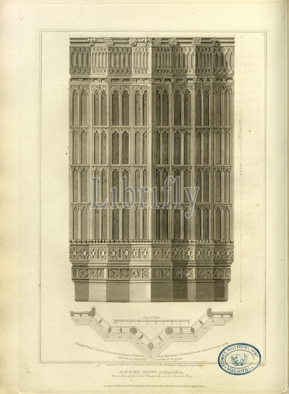 Henry VII Chapel, View, Window in the Henry VII Chapel at Westminster Abbey, signed: Engraved by J. Roffe, from a Drawing by Thompson, Fig. 15, Pl. VII, after p. 14, Thompson (drawing); Roffe, John (engraved), 1812, John Britton: The architectural antiquities of Great Britain: represented and illustrated in a series of views, elevations, plans, sections and details of various ancient English edifices: with historical and descriptive accounts of each. Bd. 2. London: J. Taylor, 1807-1826