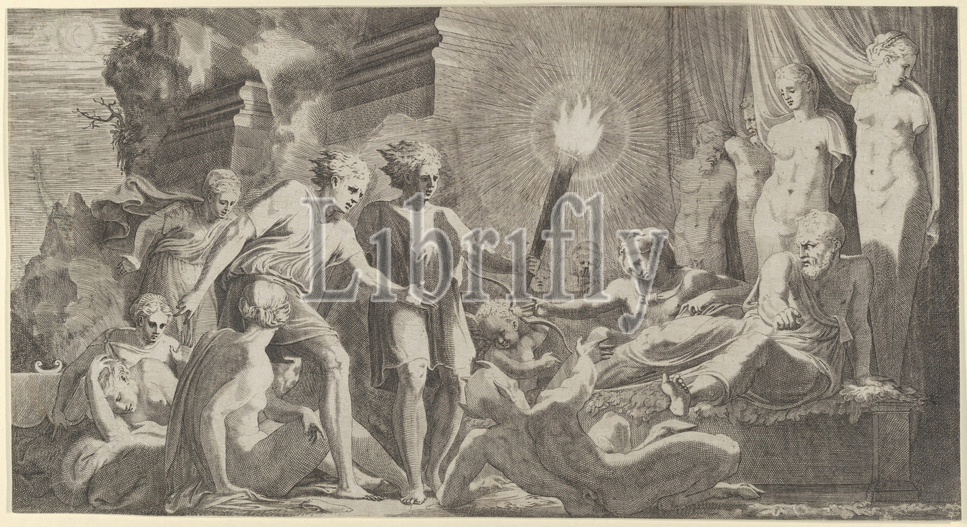 Hercules, Bed, Omphale, 1540–56, Engraving, Sheet, trimmed, 8 11/16, 16 1/4, 22, 41.2 cm, Prints, Léon Davent, French, active, After Francesco Primaticcio, Italian, Bologna, 1504/5–1570, Paris