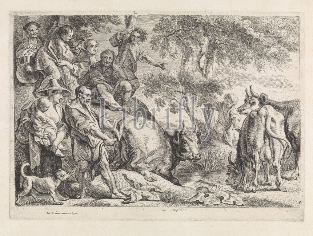 Hercules and Cacus, In a landscape near a water hole, Cacus is busy stealing a number of Hercules cattle. Cacus pulls one of the three cows depicted on its tail. In addition to Cacus, nine other figures are shown., Cow, Jacob Jordaens (I) (mentioned on object), 1652 - 1702, paper, engraving, h 226 mm × w 319 mm