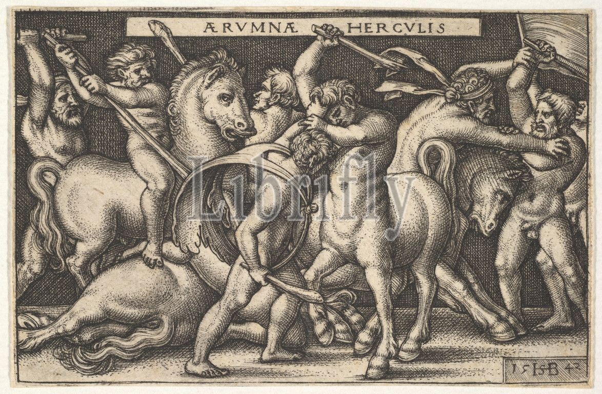 Hercules, club, center fighting, centaur, men fighting centaurs, left, right, labors, 1542, Engraving, Sheet, 2 x 3 1/8, 5.1 7.9 cm, Prints, Sebald Beham, German, Nuremberg, 1500–1550, Frankfurt