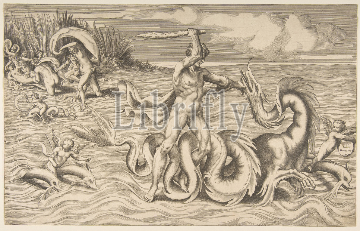 Hercules fight adragon, centre, Achelous carrying off Deianeira upper left, 1531–76, Engraving, sheet, 10 5/8 x 16 7/8, 27 42.8 cm, Prints, Giulio Bonasone, Italian, active Rome and Bologna, 1531–after, 1576