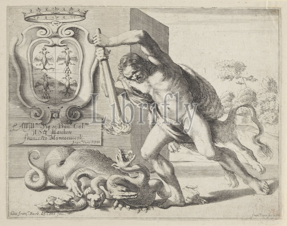 Hercules, Hydra, Lerna, Hercules tries, kill, multi-headed Hydra, burning torch, background, monument, coat, arms, 2, killed, Francesco Curti, mentioned, object, Italy, 1613, 1670, paper, engraving