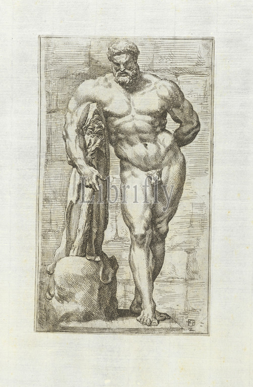 Hercules a labore quiescens, Segmenta nobilium signorum e statuarū, Perrier, François, 1590?-1656?, Engraving, 1638, Front view of the Farnese Herakles. The statue is reversed in the print.