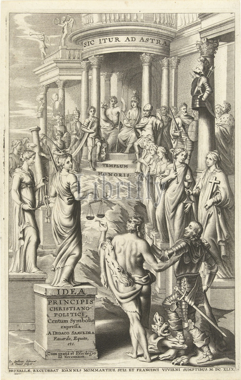 Hercules leads man, personifications, virtues, temple, eternal fame Title page, Idea principis christiano-politica, Centum Symbolis expressa, Brussels 1649, title, object, Hercules leads, man, eternal fame, ruler, wears armor, tramples, multi-headed dragon, feet, holding, club, hand, Virtues stand, attributes, pedestals, path, leads up, David, head, Goliath, biblical heroes wait, Minerva sits, throne, Inscription, frieze, temple sic itur ad astra, symbolism refers, content, edition, author makes emblems, prince, correct political leadership, help, story, Hercules, Heracles, Seven Virtues, symbolized, Honor, Glory, Ampiezza della Gloria, Gloria, Gloria de prencipi, Gloria & Honore, ' Honore, ' Sublimatà della Gloria ', Ripa, J, Danoot, mentioned, 1649, paper, engraving