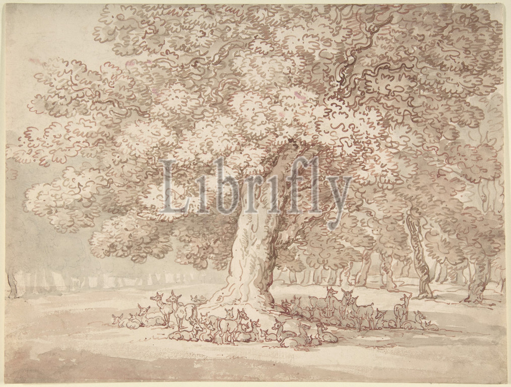Herd, deer under, oak tree, 1775–1827, Pen, brush, red, gray watercolor, sheet, 8 5/8 x 11 1/2, 21.9 29.2 cm, Drawings, Thomas Rowlandson, British, London, 1757–1827