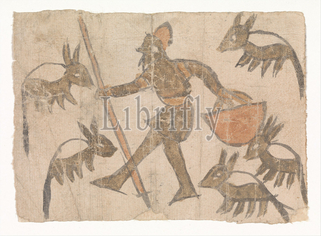 Herdsman, Flock, second half, 12th century, Attributed, Egypt, Opaque watercolor, paper, 4.12, high 5.75, wide, 10.5 cm high 14.6 wide, Codices, five quadrupeds attended, bearded herdsman, difficult, identify, closely resemble, medieval, Arab, Persian renderings, boars, scene represents, swine-herd, Christian, flock