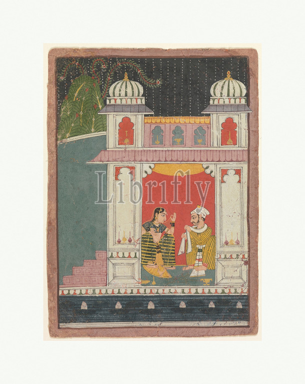 A Heroine and Her Lover in a Pavilion: Page from a Dispersed Nayikabheda, ca. 1660–80, India (Madhya Pradesh, Malwa), Ink and opaque watercolor on paper, 8 1/2 x 6 3/16 in. (21.6 x 15.7 cm), Paintings, The extensive poetic Nayikabheda literature examines the nature of romantic interactions between idealized male (nayaka) and female (nayika) types. The related paintings translate this poetry into refined visual representations that in Malwa take on formal and iconic qualities