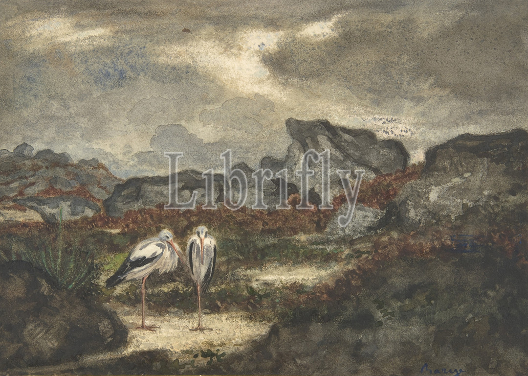 Herons in Landscape, 1810–75, Watercolor on wove paper, 6 5/8 x 8 3/4 in. (16.8 x 22.3cm), Drawings, Antoine-Louis Barye (French, Paris 1796–1875 Paris)