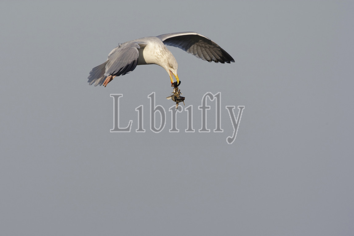 Herring Gull trying to open the mussel by falling it on a hard surface, Netherlands