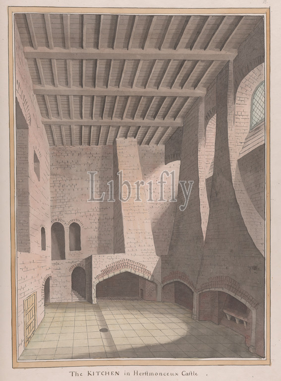 Herstmonceux Castle, East Sussex: The Kitchen, James Lambert of Lewes, 1725–1788, British, undated, Graphite and watercolor within triple-ruled and wash border on moderately thick, moderately textured, cream laid paper, Sheet: 25 1/4 x 18 5/8 inches (64.1 x 47.3 cm), architectural subject, castle, drains, fireplace, interior, kitchen, leaded lights, stairs, East Sussex, England, Europe, Herstmonceux, United Kingdom