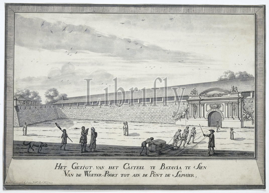 Het Gezigt from the Casteel in Batavia in Sien from the Waeter-Poort to the Punt de Saphier (title on object), View of the Castle of Batavia. In the foreground different figures, a dog and four men pulling a loaded cart in the direction of a gate in the wall of the fortress. The bare wall runs the entire width of the drawing with the gate on the right decorated with allegorical figures and the initials of the V.O.C., fortress, castle, Batavia, Batavia castle, Dutch East India Company, Johannes Rach (signed by artist), 1767, paper, ink, brush, h 35.5 cm × w 50 cm