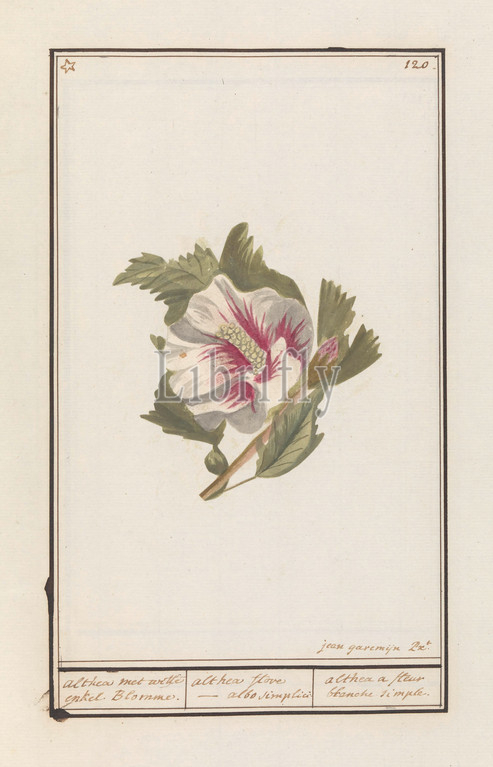 Hibiscus (Hibiscus syriacus) Althea with white ankle Blomme. / althea flore - albo simplici. / althea a fleur blanche simple (title on object), White hibiscus with a red heart. Numbered top right: 120. Top left marked with an asterisk. Part of the second album with drawings of flowers and plants. Ninth of twelve albums with drawings of animals, birds and plants known around 1600, commissioned by Emperor Rudolf II. With explanation in Dutch, Latin and French., Jan Anton Garemyn (mentioned on object), Bruges, 1790 - 1799, paper, watercolor (paint), deck paint, brush, h 430 mm × w 270 mm