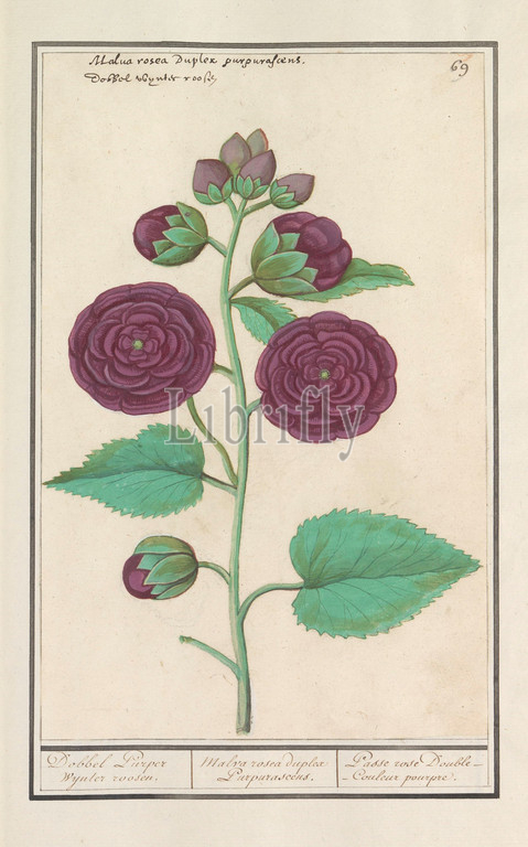 Hollyhock, Alcea rosea, Dobbel Purple wynter roosen, Malva rosea duplex Purpurasceus, Passe rose Double, Couleur pourpre, title, object, purple double flowers, Numbered top right, 69, top, Latin, Dutch name, Part, first album, drawings, flowers, plants, Eighth, twelve albums, animals, birds, 1600, commissioned, Emperor Rudolf II, explanation, Dutch, French, NAME, Anselmus Boetius de Boodt, 1596, 1610, paper, watercolor, paint, deck paint, chalk, ink, pen