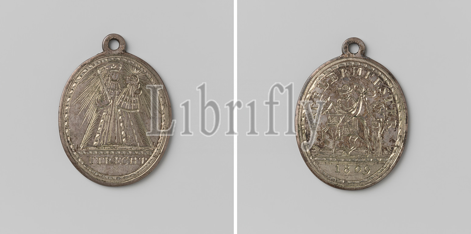 Holy Virgin, Utrecht, St. Maarten, medal, inscription brother-in-law, black-and-white oval medal, eyebolt, Obverse, standing, halo, crowned Mary, scepter, right hand, Christ child, arm, cut off, inscription, Back, St Maarten, turned, left, horse, cuts, cloak, sword, give part, man standing next, stick inside, year, 1809, black-and-white, metal, engraving