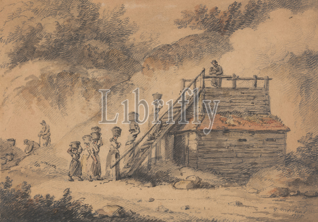 A Hop Kiln, George Morland, 1763–1804, British, 1795, Watercolor and graphite with pen and black ink on medium, slightly texture, beige wove paper, Sheet: 6 1/16 × 8 1/16 inches (15.4 × 20.5 cm), architectural subject, baskets, beer, brewers, dresses, genre subject, hop kiln, malthouse, men, oast, oasthouses, railings, road, skirts, stairs, women