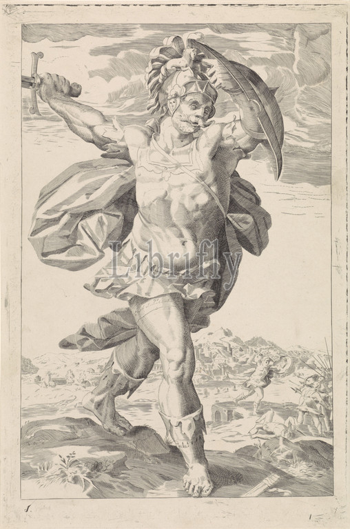 Horace Cocles Roman heroes, series title, hero Horace Cocles, full, feet, sword raised, right hand, shield, left hand, background you, see, takes, entire army, banks, Tiber, Horace Cocles, Pons Sublicius, single-handed, keeps, Etruscans, bay, bridge, broken down, Romans, escapes, jumping, Frederik Nicolaas Horatius Witsen Geysbeek, mentioned, object, Amsterdam, -1829, paper, engraving