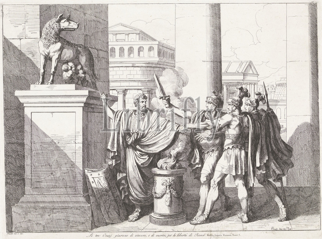 Horatii swear, fight, Rome, Bartolomeo Pinelli, 1817, father, Horatii, three sons, altar, front, statue, Lupa Capitolina suckling, twins Romulus, Remus, swear, will fight, freedom, city, Rome, print maker, Bartolomeo Pinelli, mentioned, object, Bartolomeo Pinelli, mentioned, object, Rome, 1817, paper, etching, h 320 mm × w 428 mm