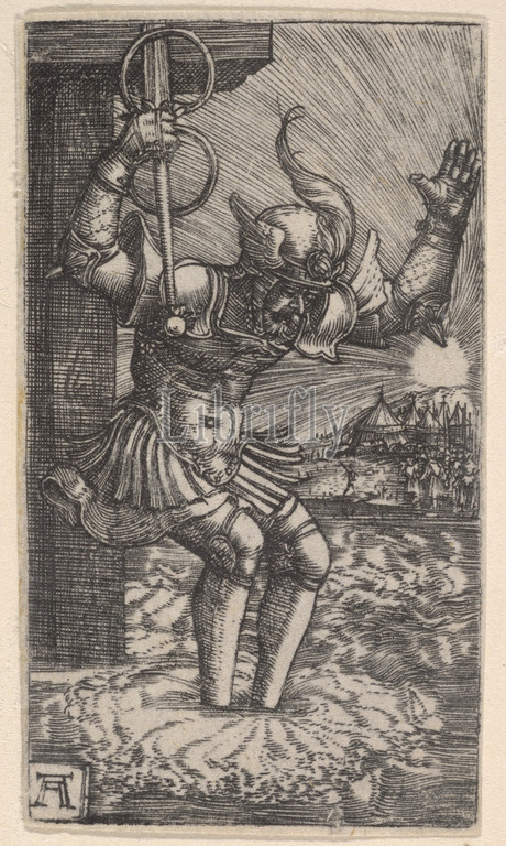 Horatius Cocles Leaping, Tiber, Engraving, Sheet, 2 5/8, 1 1/2, 6.7, 3.8 cm, Prints, Albrecht Altdorfer, German, Regensburg ca., 1480–1538, Regensburg