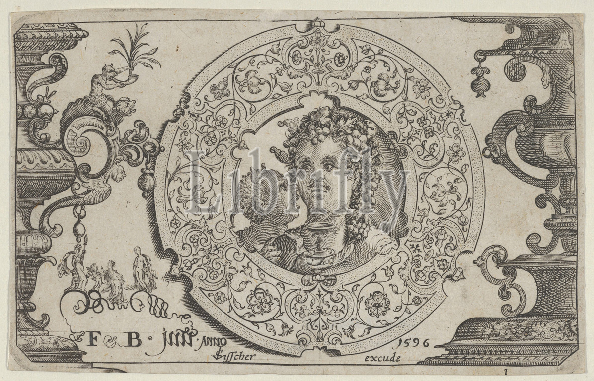 Horizontal Panel, Bacchus, Medallion, 1596, Engraving, Sheet, 3 1/4, 5 3/16, 8.2, 13.1 cm, Claes Jansz. Visscher, Dutch, Amsterdam, 1586–1652, after Floris Balthasarsz van Berckenrode, Delft ca., 1562–1616, Delft