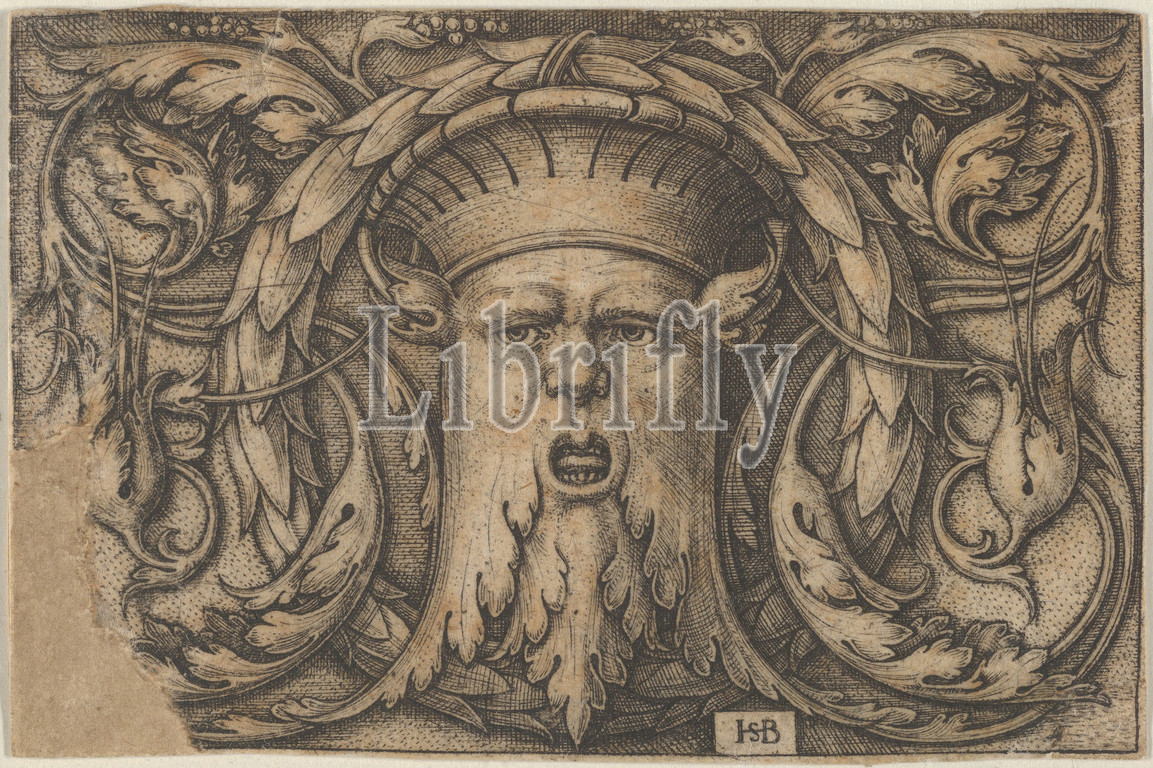 Horizontal Panel, Bearded Amascaron, Medallion, Center Surrounded, Tendrils, 1543, Engraving, second state, two, Pauli, Sheet, 2 x 3, 5.1 7.6 cm, Sebald Beham, German, Nuremberg, 1500–1550, Frankfurt, Panel, mask, large, open-mouthed, bearded face, center, surrounded, wreath, tendrils