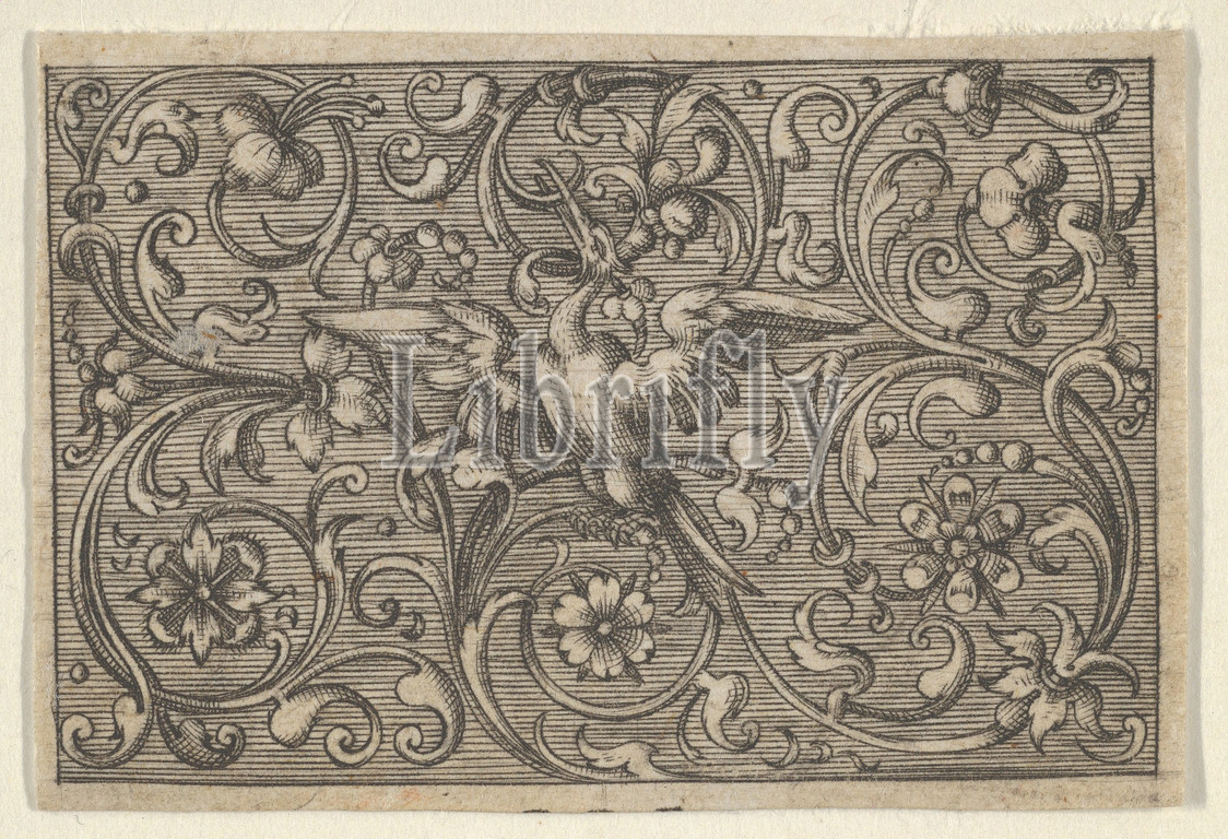 Horizontal Panel with a Bird, from Varii Generis Opera Aurifabris Necessaria, ca. 1600, Engraving; first of two states (SKB), Sheet: 1 5/16 × 2 in. (3.4 × 5.1 cm), Paul Birckenhultz (1561–1639), Ornamental frieze with a large bird with out-stretched wings at center, surrounded by scrolling tendrils. The bird holds the end of a tendril in its long, straight beak. From a series of six plates with horizontally hatched backgrounds