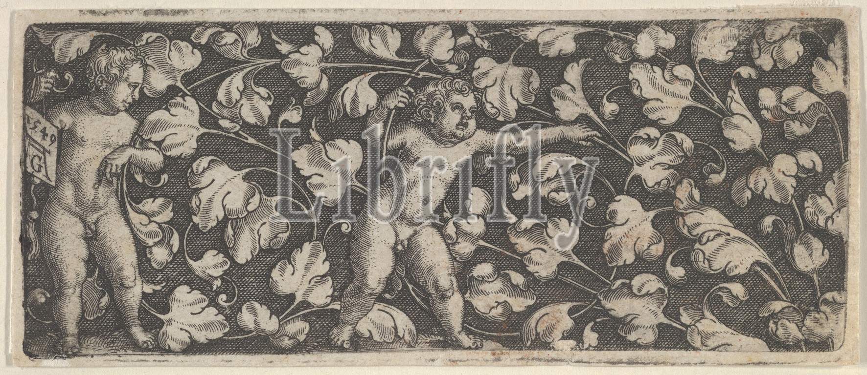 Horizontal Panel with Two Nude Boys Surrounded by Tendrils, 1549, Engraving; second state of three (Hollstein), Sheet: 1 5/8 × 3 7/8 in. (4.2 × 9.8 cm), Heinrich Aldegrever (German, Paderborn ca. 1502–1555/1561 Soest), An ornamental design with foliage and two nude boys; one at left presenting monogram and other at center amidst the foliage.