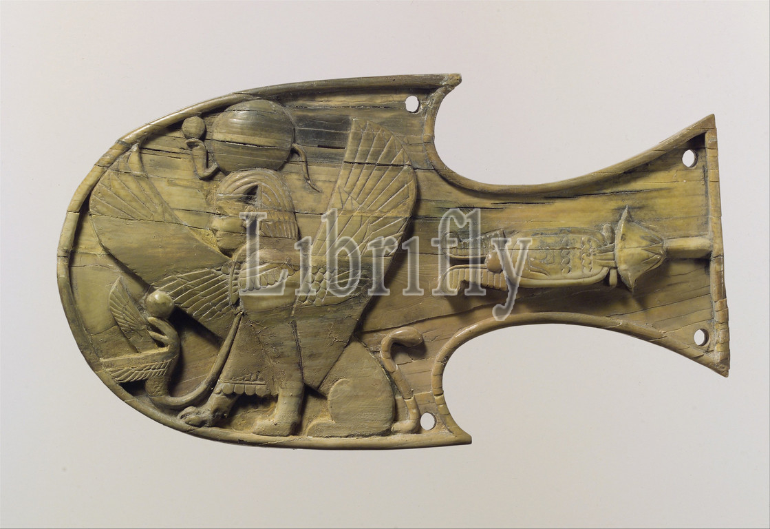 Horse blinker carved, relief, seated sphinx, Neo-Assyrian, ca, 8th century B.C, Mesopotamia, Nimrud, ancient Kalhu, Assyrian, Ivory, 4.13 x 7.32, 10.49 18.59 cm, Ivory/Bone-Equestrian-Inscribed, craftsmen, carved ivories, Phoenician style, strongly influenced, Egyptian art, ivories illustrate, Egyptian, themes, motifs, entirely original, compositions, Phoenician-style, primarily, furniture decoration