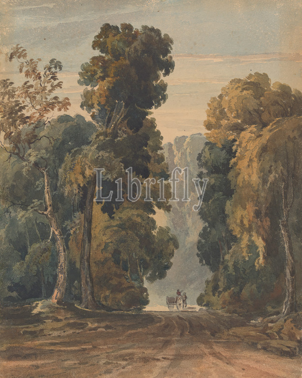 Horse, Cart, Driver, Wide, Tree-lined Lane, Thomas Sully, 1783–1872, American, Watercolor, graphite, gouache, moderately thick, moderately textured, beige, wove paper, Sheet