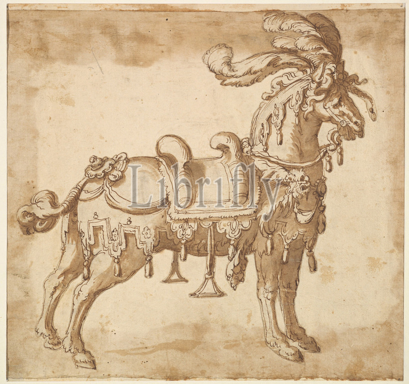 Horse Dressed Up, Tournament, Ceremonial Entry, ca, 1620–56, Brown ink, wash, Sheet, 9 3/16 x 11 7/16, 23.4 29 cm, possibly, by Baccio del Bianco, Italian, Florence, 1604–1656, Escorial, and workshop, Drawing, horse dressed up, tournament, ceremonial entry, depicted, side, facing right, horse, outftted, elaborate headdress, remarkable, lion, skin, seems, blanket under, saddle