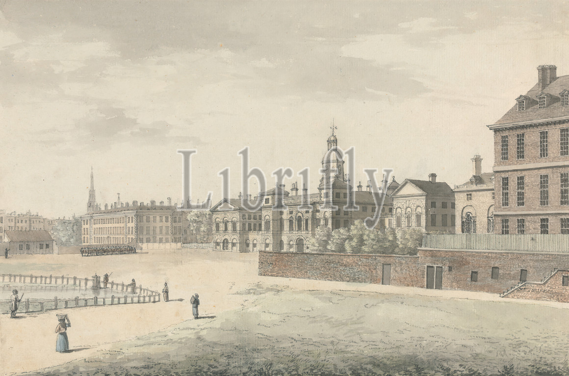 Horse Guard's Parade, Whitehall, Samuel Hieronymus Grimm, 1733–1794, Swiss, Watercolor, pen, black ink, graphite, medium, slightly textured, cream laid paper, Sheet, buildings, fences, genre subject, horse, animal, men, steps, trees, women, Whitehall