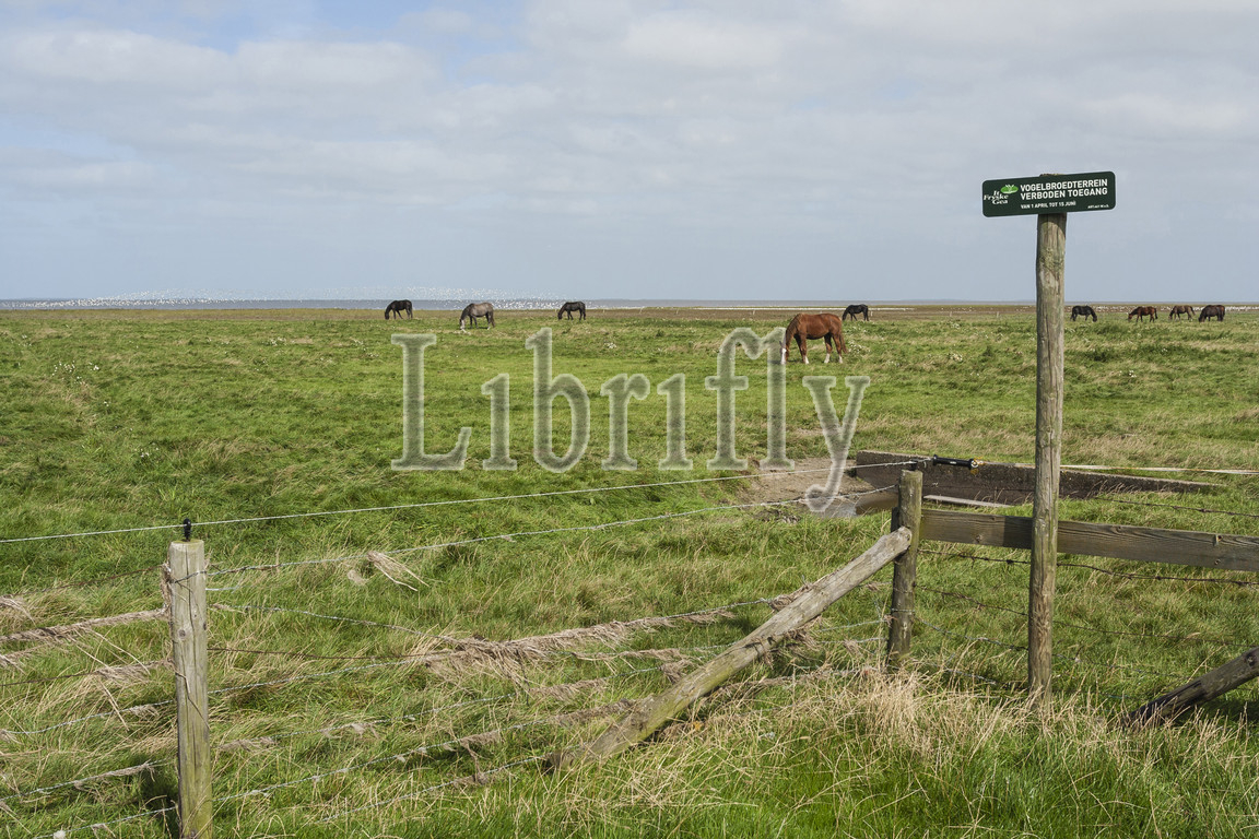 Horses grazing in grassland with gulls in background, The Netherlands