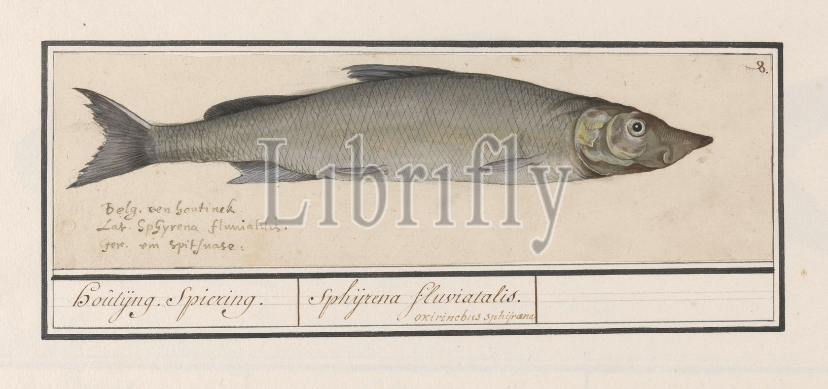 Houting (Coregonus oxyrinchus), Houtijng. Smelt. / Sphijrena fluviatalis. (title on object), Houting. Numbered top right: 8. Bottom left the name in three languages. Part of the sixth album with drawings of fish, shells and insects. Sixth of twelve albums with drawings of animals, birds and plants known around 1600, commissioned by Emperor Rudolf II. With explanation in Dutch, Latin and French, bony fishes (with NAME), Anselmus Boetius de Boodt, 1596 - 1610, paper, pencil, chalk, watercolor (paint), deck paint, ink, lacquer (coating), pen, h 128 mm × w 294 mm