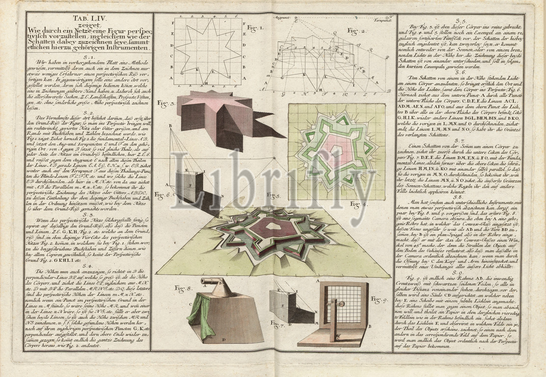 perspectively imagine, figure, netting, draw, shadow, Instructions, perspective drawing, bodies, shadows, instruments, tab. LIV, p. 61, Tobias Mayer, Mathematischer Atlas, welchem auf 60 Tabellen alle Theile der Mathematic vorgestellet, nicht allein überhaupt zu bequemer Wiederholung, sondern auch den Anfängern besonders zur Aufmunterung durch deu, Figuren entworfen werden, Augspurg, Pfeffel, 1745