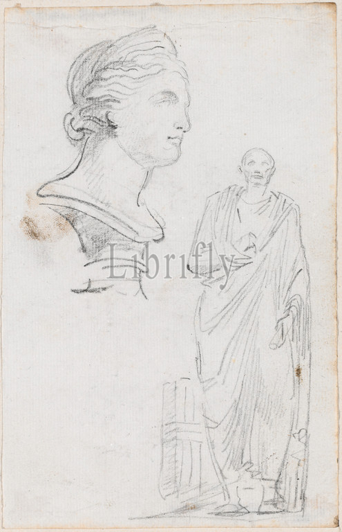 Hubert Robert, (artist), French, 1733 - 1808, Bust of a Roman Woman and Statue of a Roman Man, Album of Drawings: p.19, (series), probably c. 1754/1765, black chalk on laid paper, Overall: 16.5 x 10.5 cm (6 1/2 x 4 1/8 in.), support: 21.5 x 15.6 cm (8 7/16 x 6 1/8 in.)