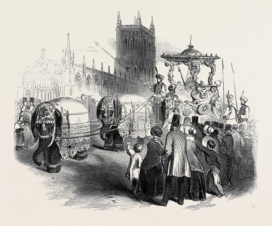 hughes's, animal, mammal, elephant, coach, carriage, gloucester, uk, 1845 engraving, engraved image, history, illustrative technique, engravement, victorian, arts, culture, retro styled, vintage, retro, arkheia