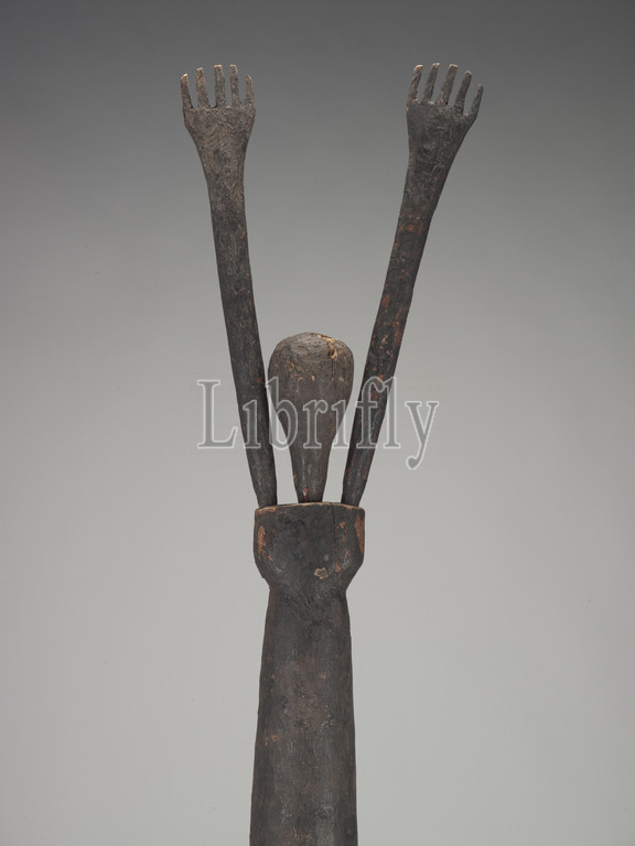 human figure, Lengola people, early 20th century, wood, pigment, incrustation, 80 x 14-1/4 x 5-1/2 in., African Art