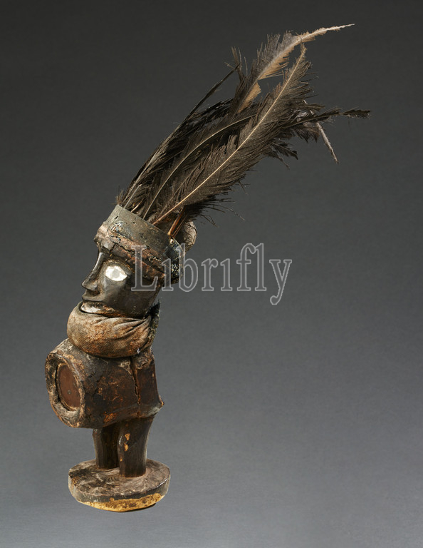 human figure (Nkisi), Yombe people, late 19th century - early 20th century, wood, glass, cloth, resin, feathers, 12-1/2 x 9 x 2-3/4 in. (including feathers), African Art